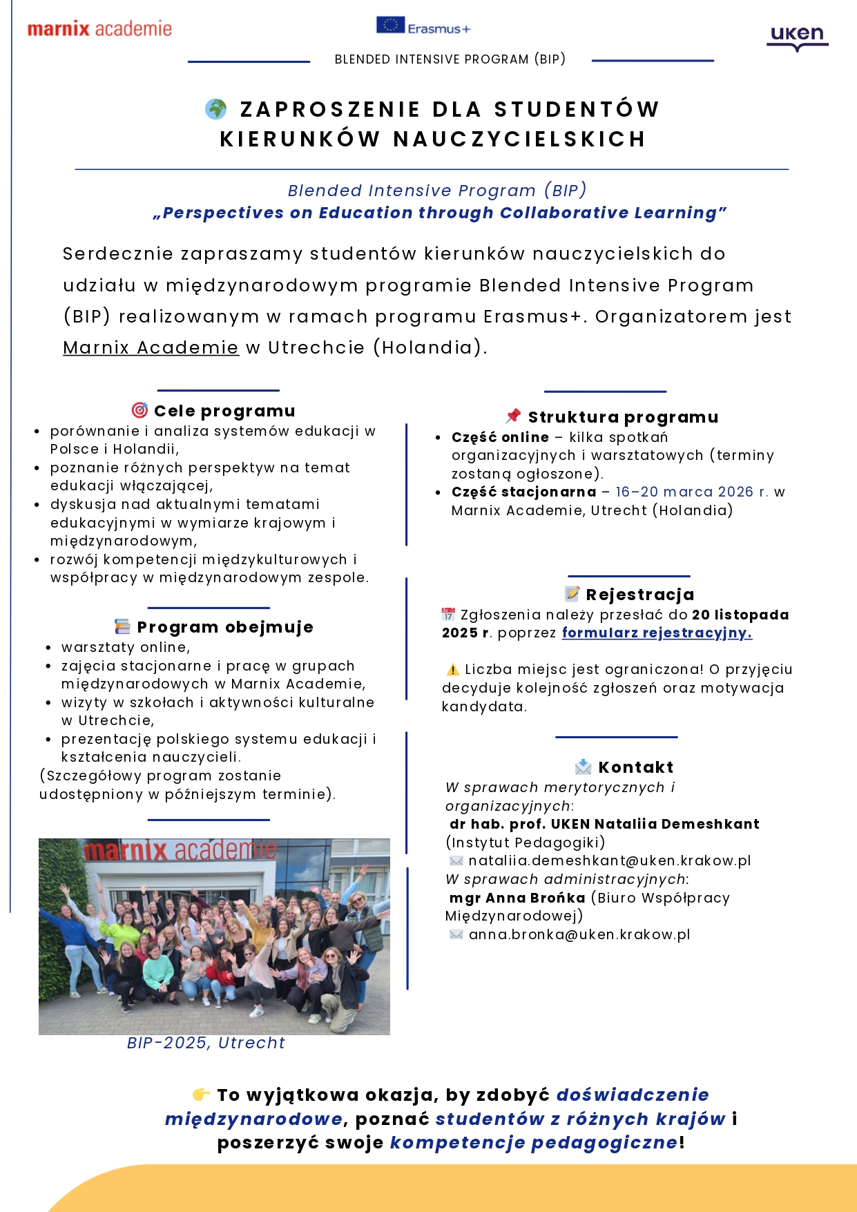 Serdecznie zapraszamy do udziału w Blended Intensive Program (BIP) „Perspectives on Education through Collaborative Learning”, organizowanym wspólnie z Marnix Academie w Utrechcie (Holandia) w ramach programu Erasmus+.