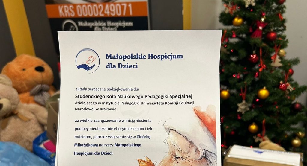 W dniach od 2 do 10 grudnia Studenckie Koło Naukowe Pedagogiki Specjalnej zorganizowało zbiórkę świąteczną na rzecz Małopolskiego Hospicjum dla Dzieci w Krakowie. Celem akcji było wsparcie podopiecznych Hospicjum oraz ich rodzin w szczególnie wyjątkowym, świątecznym czasie.