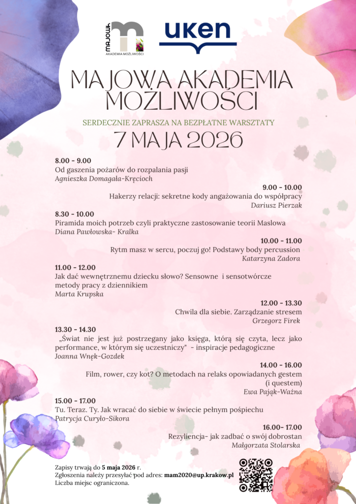 Serdecznie zapraszamy na tegoroczną Majową Akademię Możliwość, która odbędzie się 7 maja (czwartek) 2026 roku w budynku przy ulicy Ingardena 4.