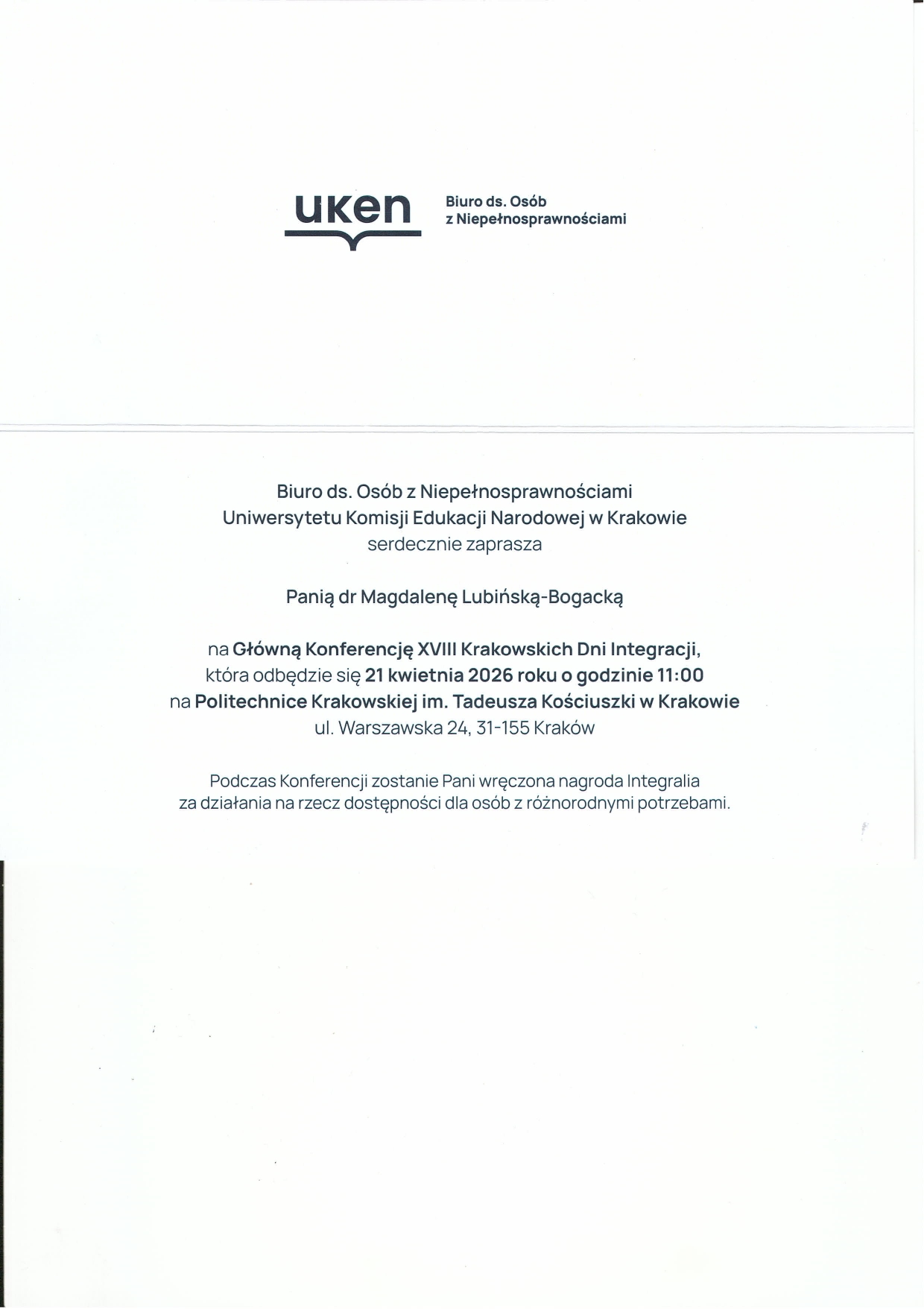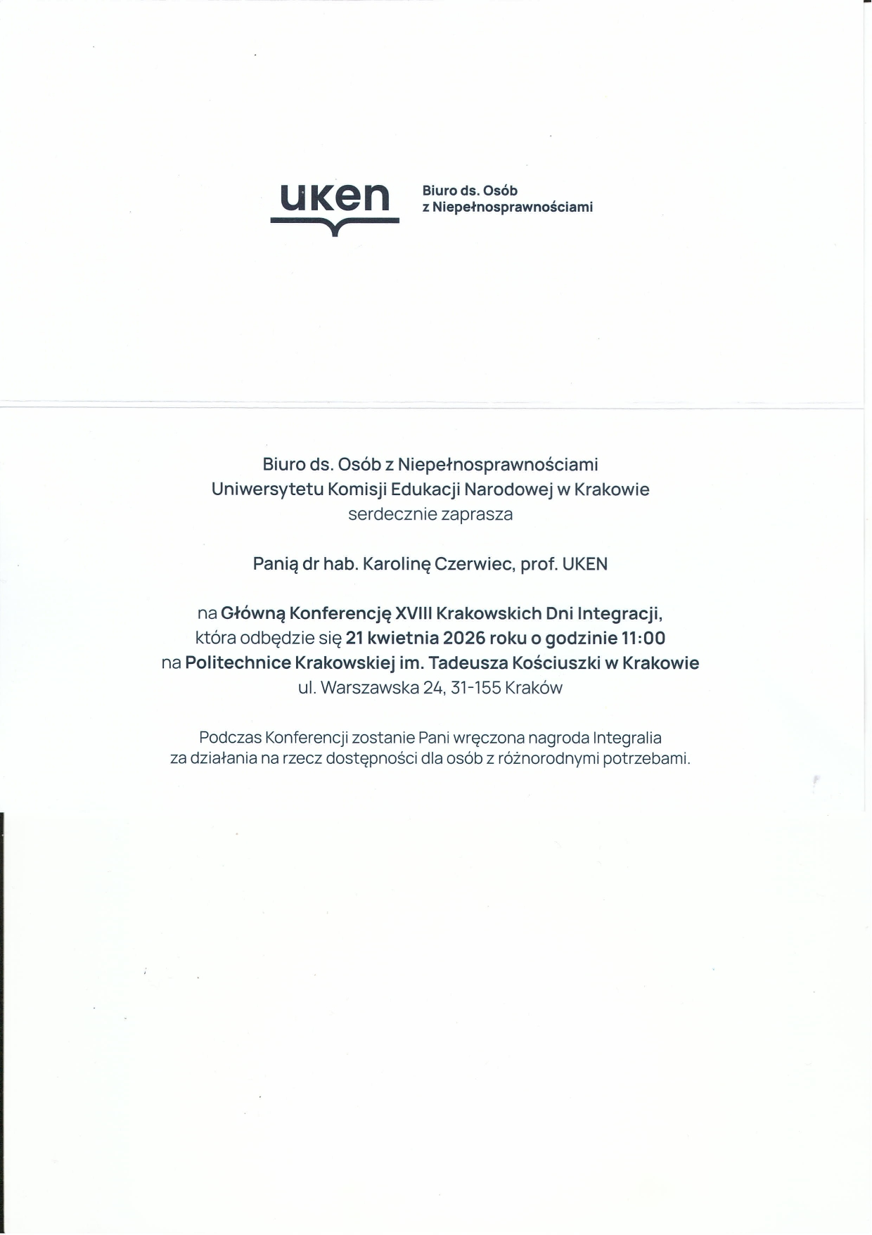 Nagrody dla nauczycieli Nagrody Integralia za działania na rzecz dostępności dla osób z różnorodnymi potrzebami dla Pani dr Madaleny Lubińskiej-Bogackiej oraz Pani dr hab. Karoliny Czerwiec, prof.UKEN